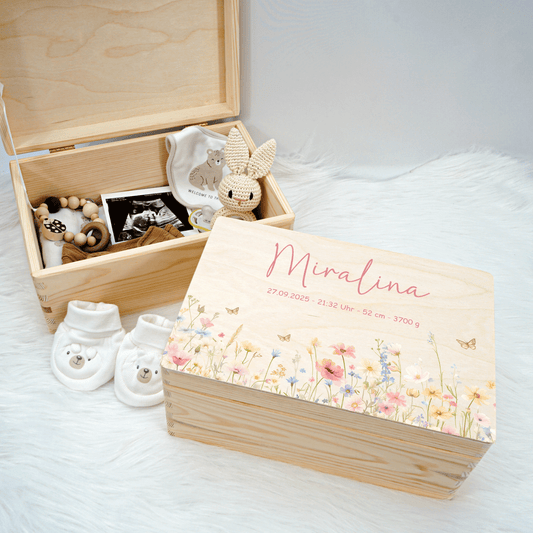 Diese Holzkiste mit unserem Wunschmotiv und den Daten unseres Babys ist so eine schöne Geschenkidee