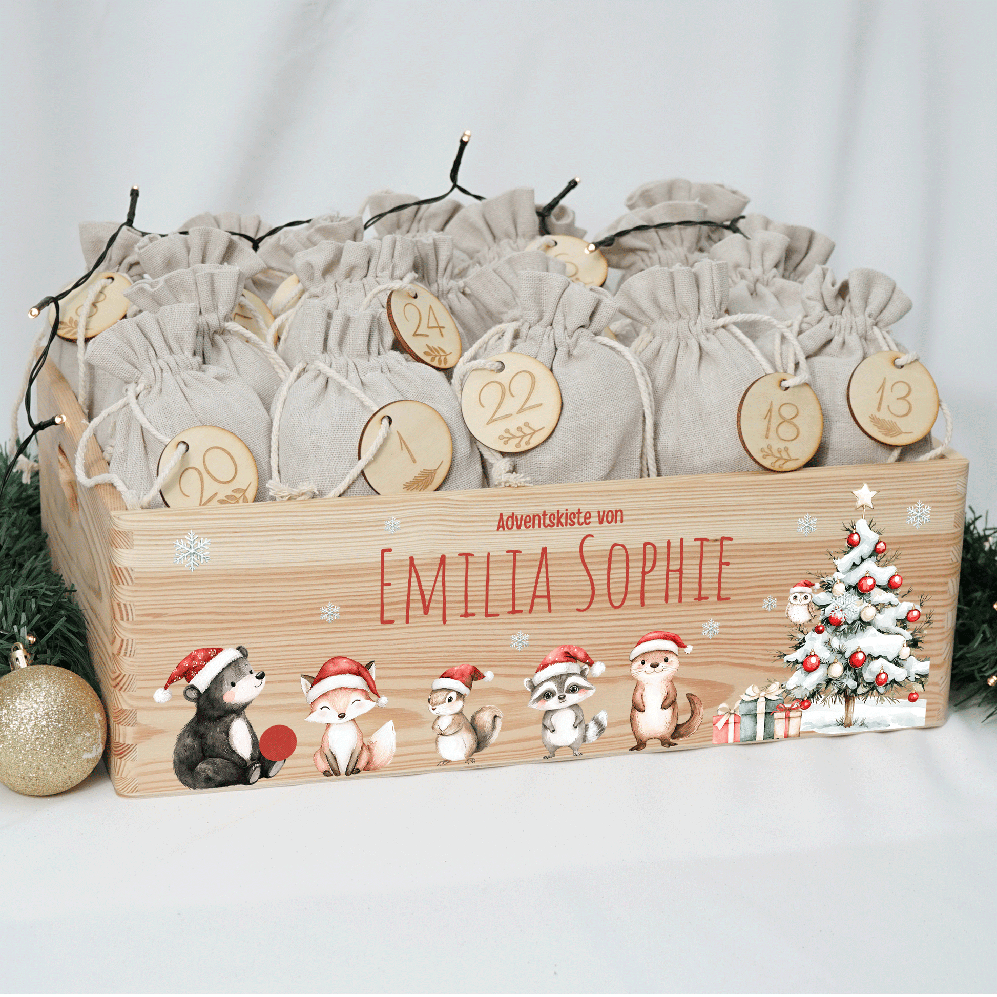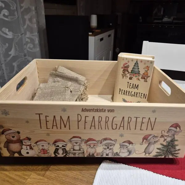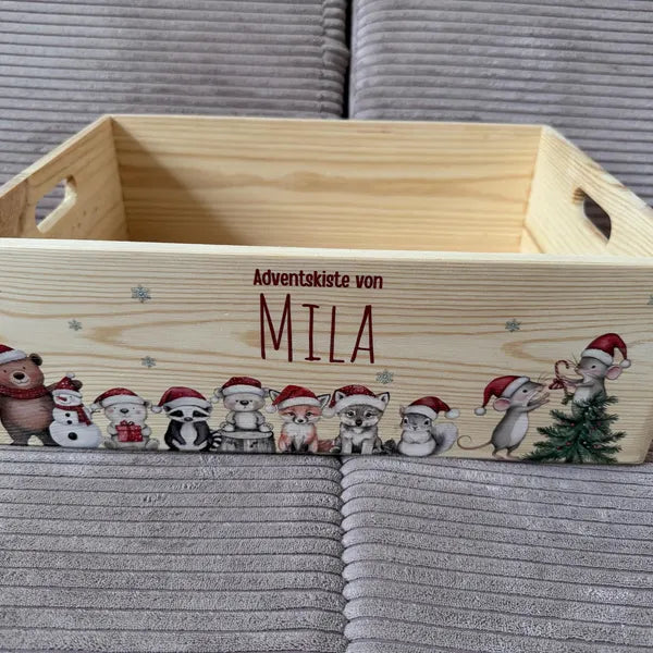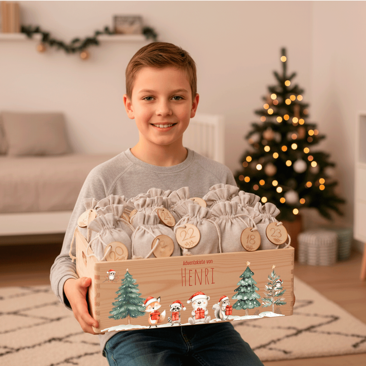 Verschenke unvergessliche Adventsmomente: Unsere hochwertige Holzkiste wird individuell mit Namen und Motiv gestaltet, ist nachhaltig wiederverwendbar und sorgt Jahr für Jahr für strahlende Kinderaugen.