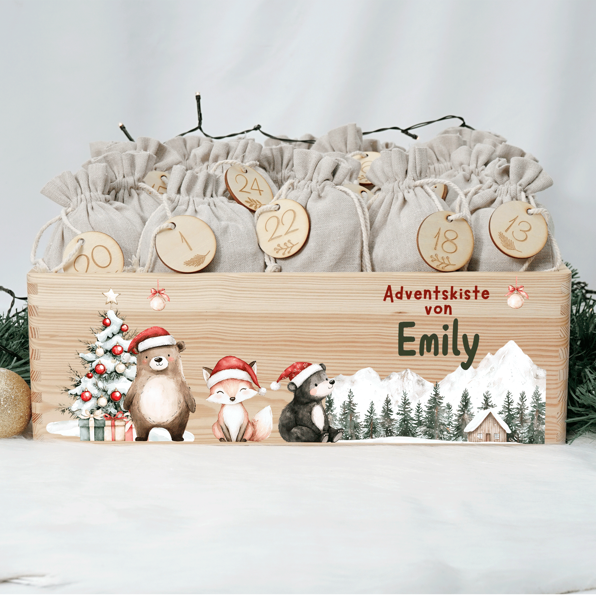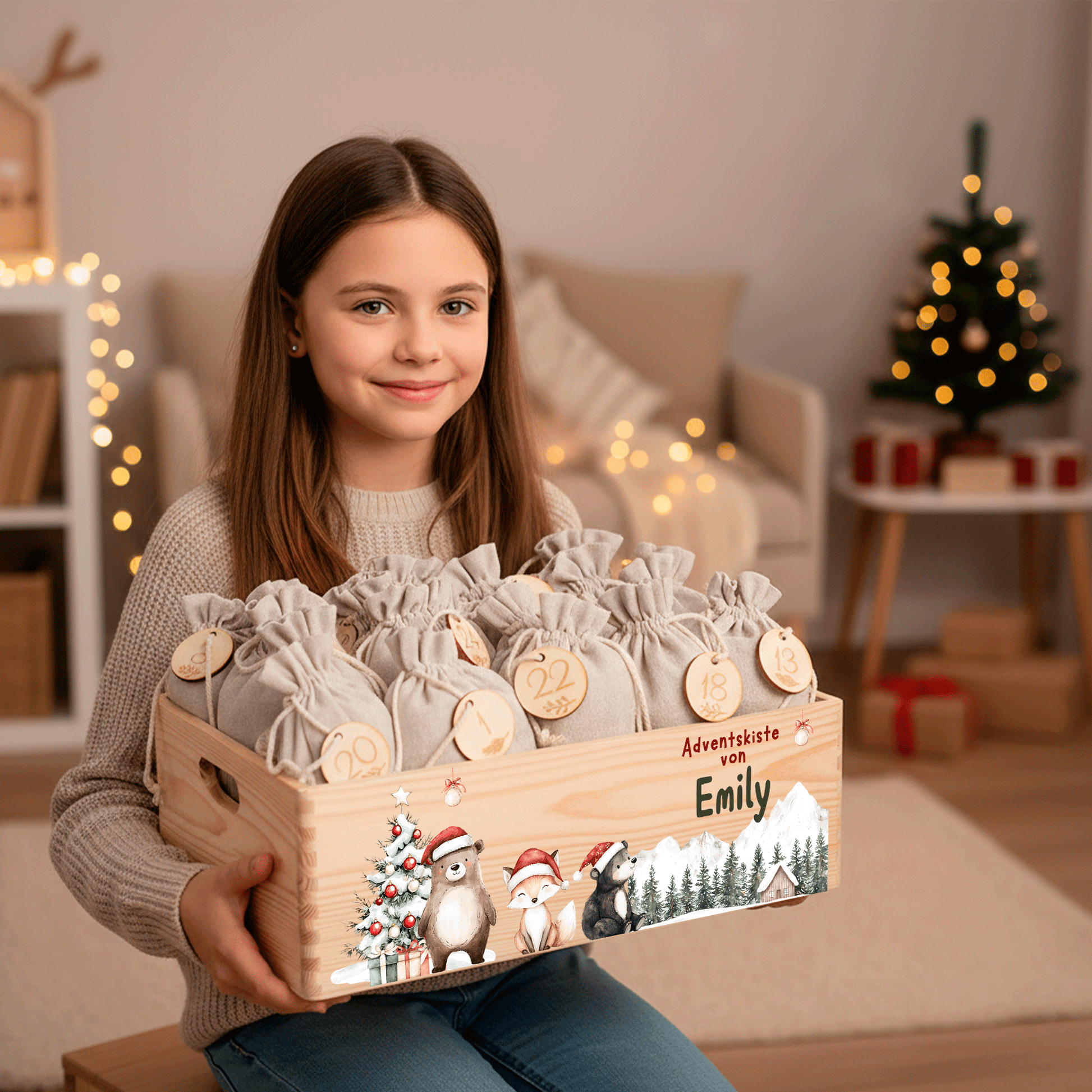 Verschenke unvergessliche Adventsmomente: Unsere hochwertige Holzkiste wird individuell mit Namen und Motiv gestaltet, ist nachhaltig wiederverwendbar und sorgt Jahr für Jahr für strahlende Kinderaugen.