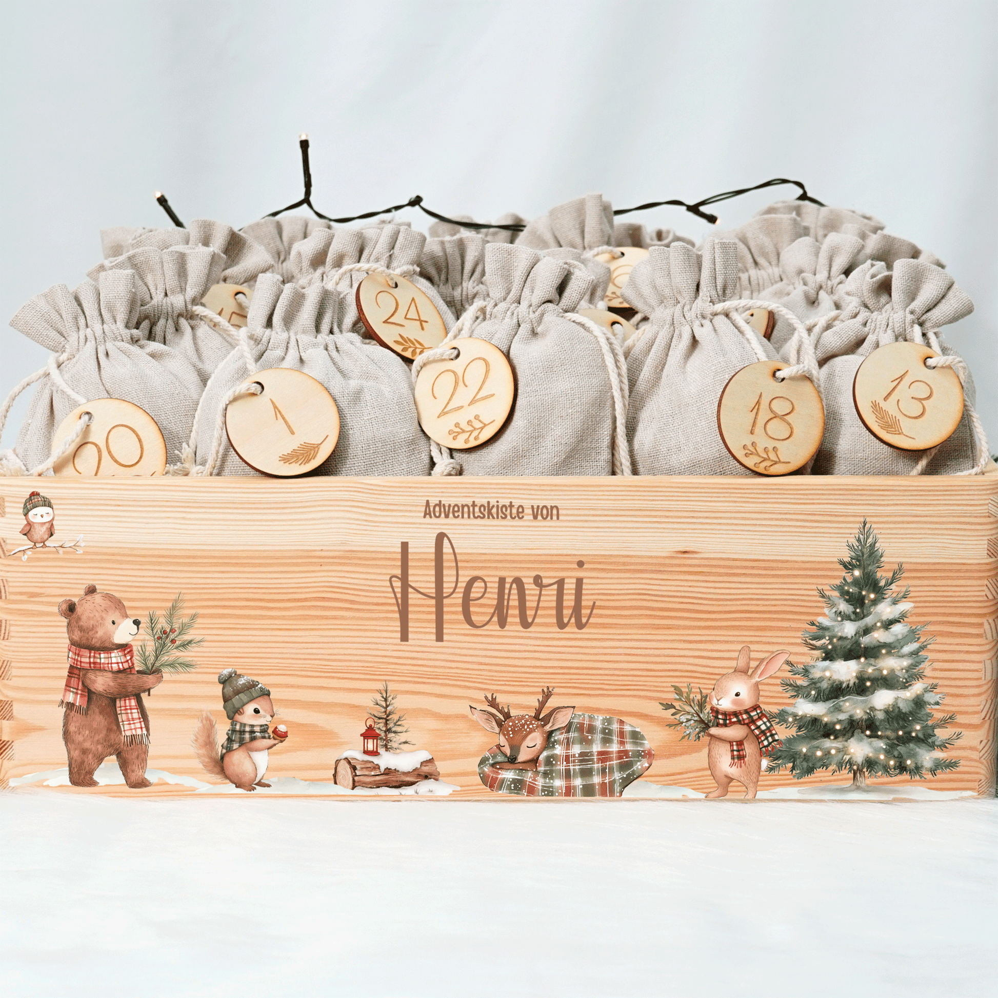 Unsere personalisierte Adventskiste sorgt Tag für Tag für leuchtende Augen. Individuell gestaltet, nachhaltig gefertigt und jedes Jahr wiederverwendbar – ein Geschenk voller Magie, Freude und unvergesslicher Momente.