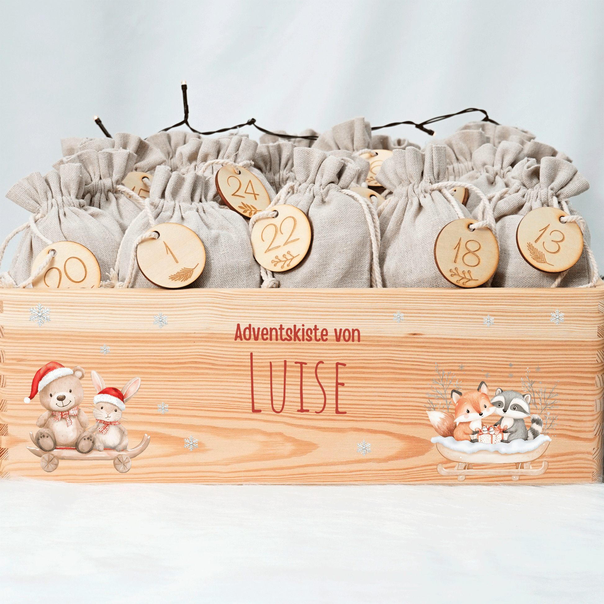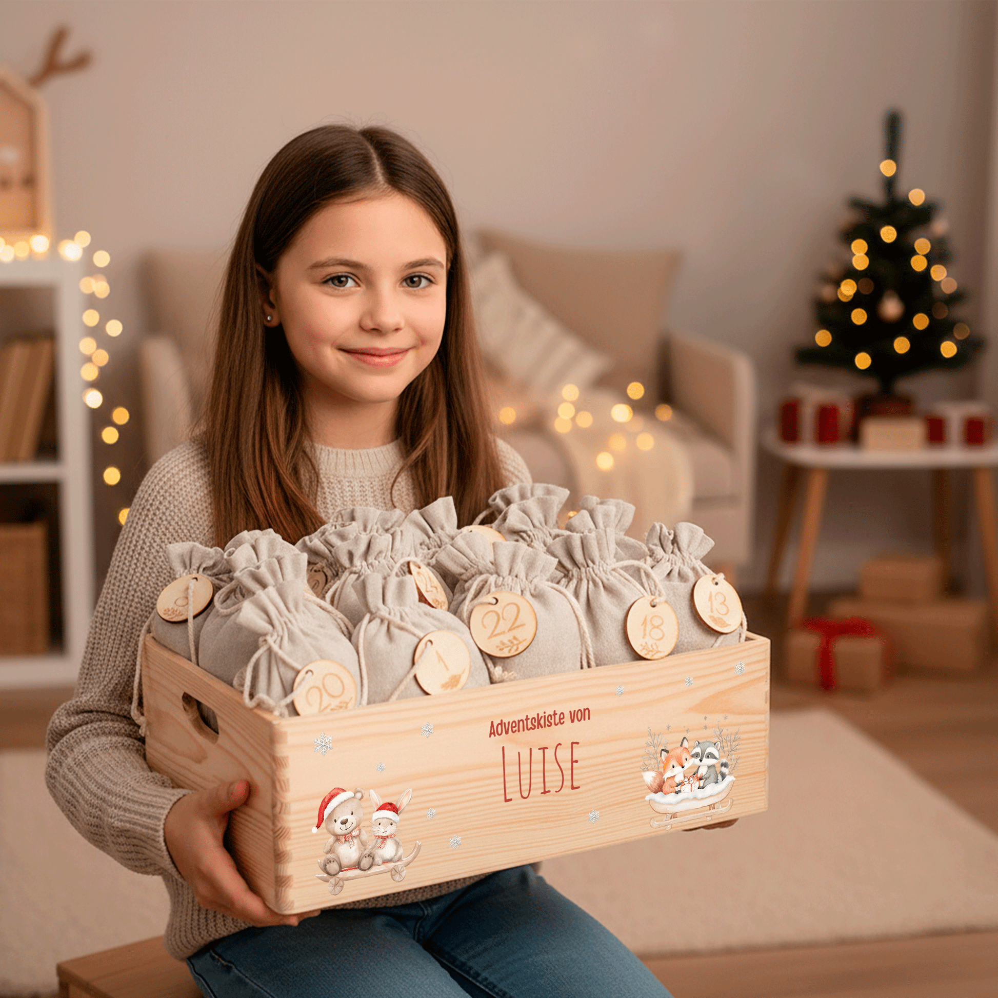 Verschenke unvergessliche Adventsmomente: Unsere hochwertige Holzkiste wird individuell mit Namen und Motiv gestaltet, ist nachhaltig wiederverwendbar und sorgt Jahr für Jahr für strahlende Kinderaugen.