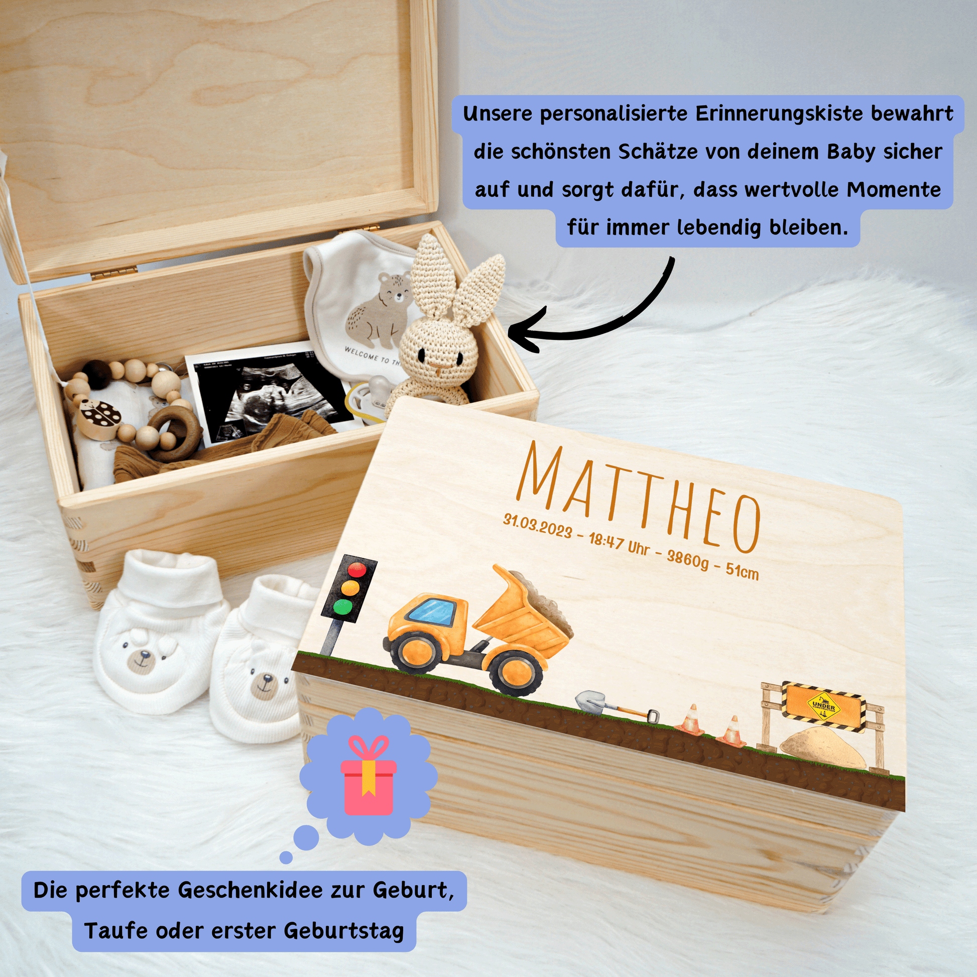 Die Kiste ist das ideale Geschenk zur Geburt 👶, Taufe, dem ersten Geburtstag 🎂 oder zu anderen besonderen Lebensmomenten. Ein Erinnerungsstück, das über viele Jahre Freude bereitet.