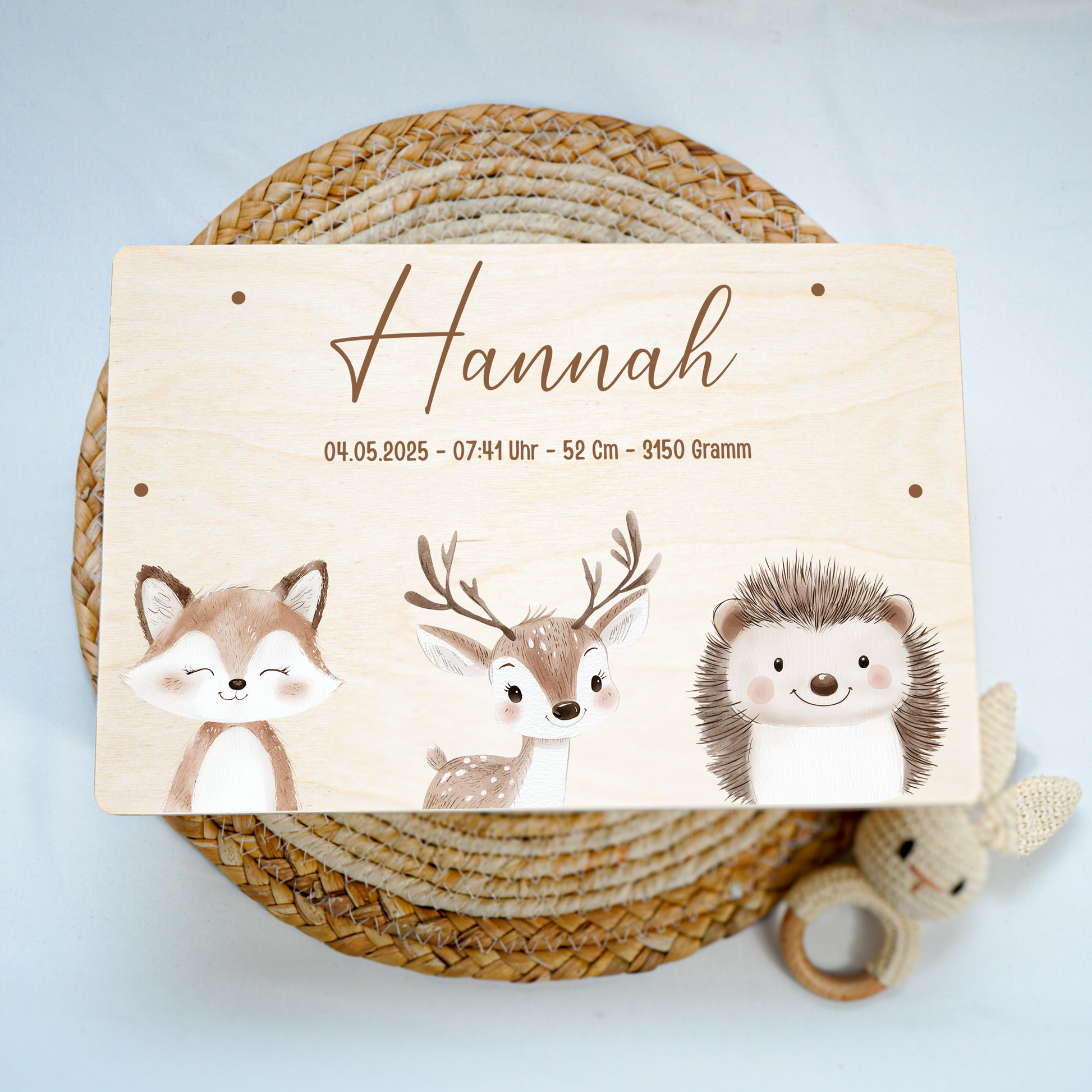 Jede Kiste ist mit viel Sorgfalt gestaltet und wird individuell für dich personalisiert – mit Namen, Geburtsdaten oder einer kleinen Botschaft.