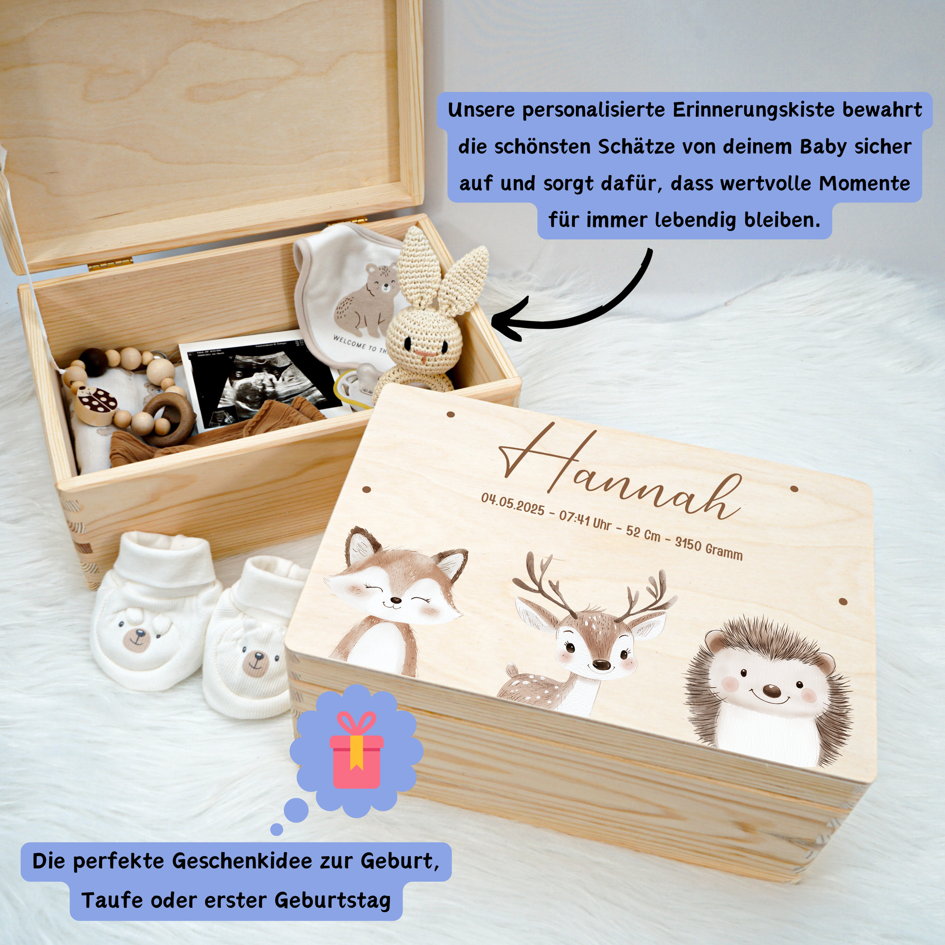 Die Kiste ist das ideale Geschenk zur Geburt 👶, Taufe, dem ersten Geburtstag 🎂 oder zu anderen besonderen Lebensmomenten. Ein Erinnerungsstück, das über viele Jahre Freude bereitet.