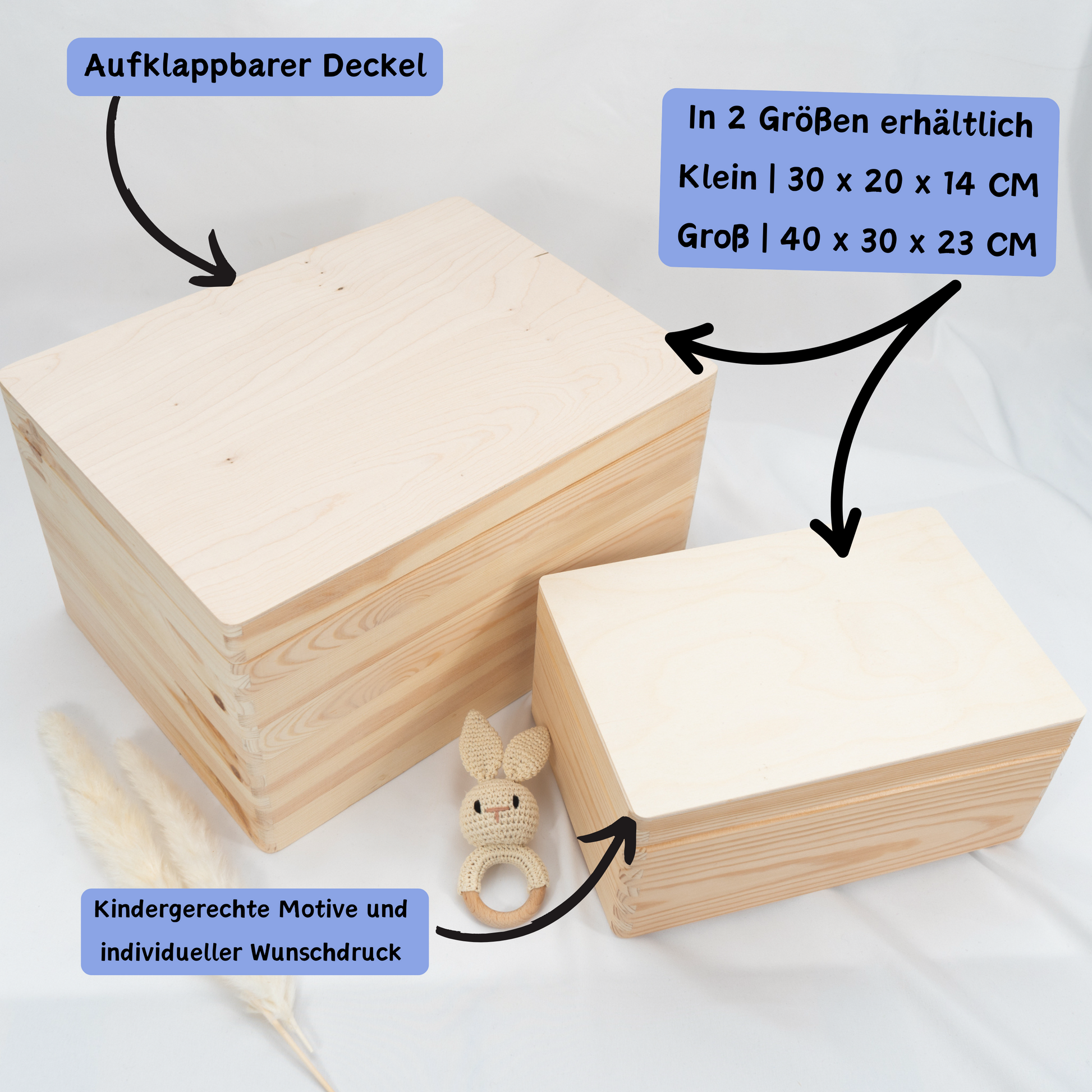 Unsere Kisten bestehen aus hochwertigem, unbehandeltem Holz 🌿. Die Motive werden mit einem innovativen Druckverfahren direkt ins Holz gebracht – ohne Folie oder Aufkleber. Wir verwenden dafür eine EN71-3 zertifizierte Tinte, die auch für Kinderspielzeug geeignet ist.