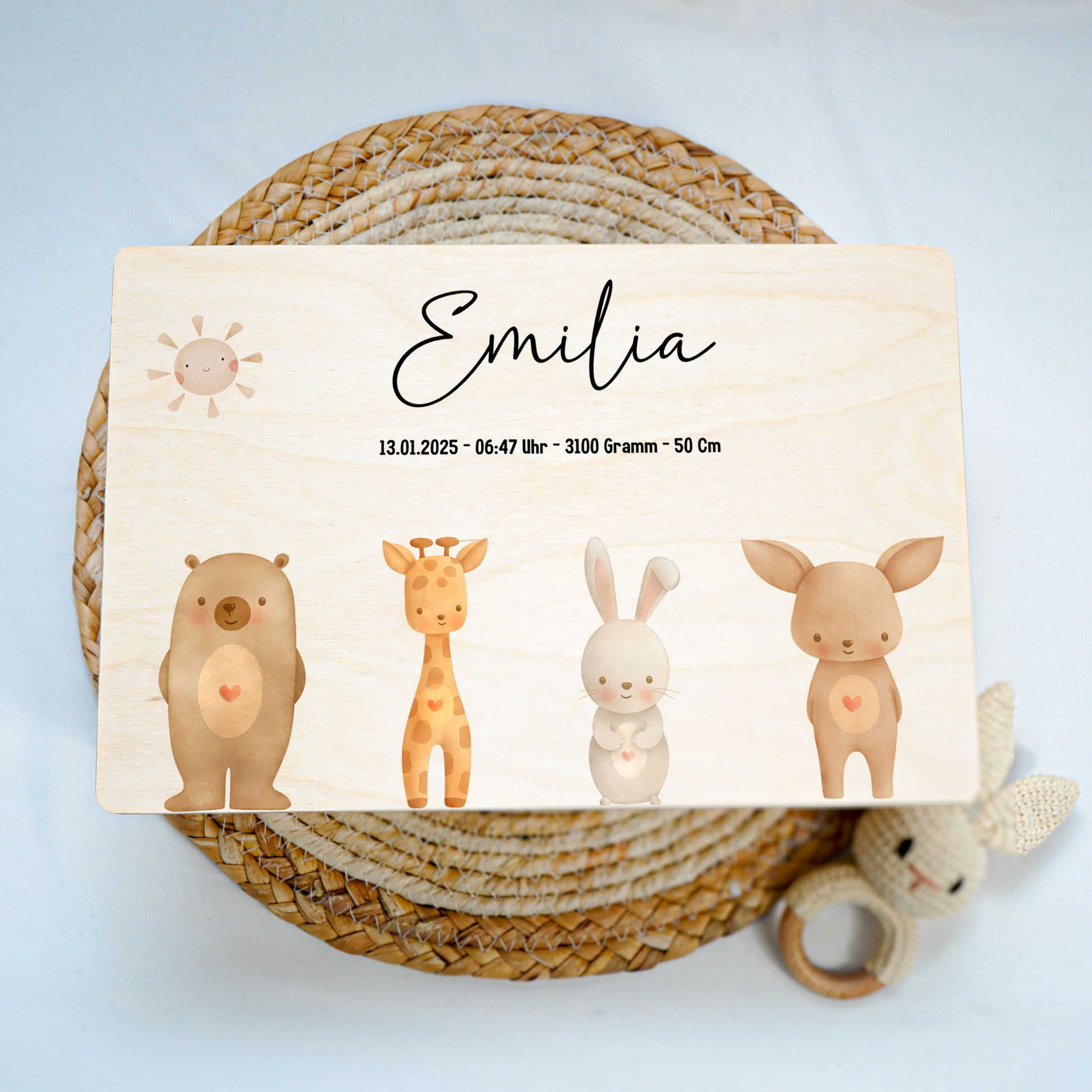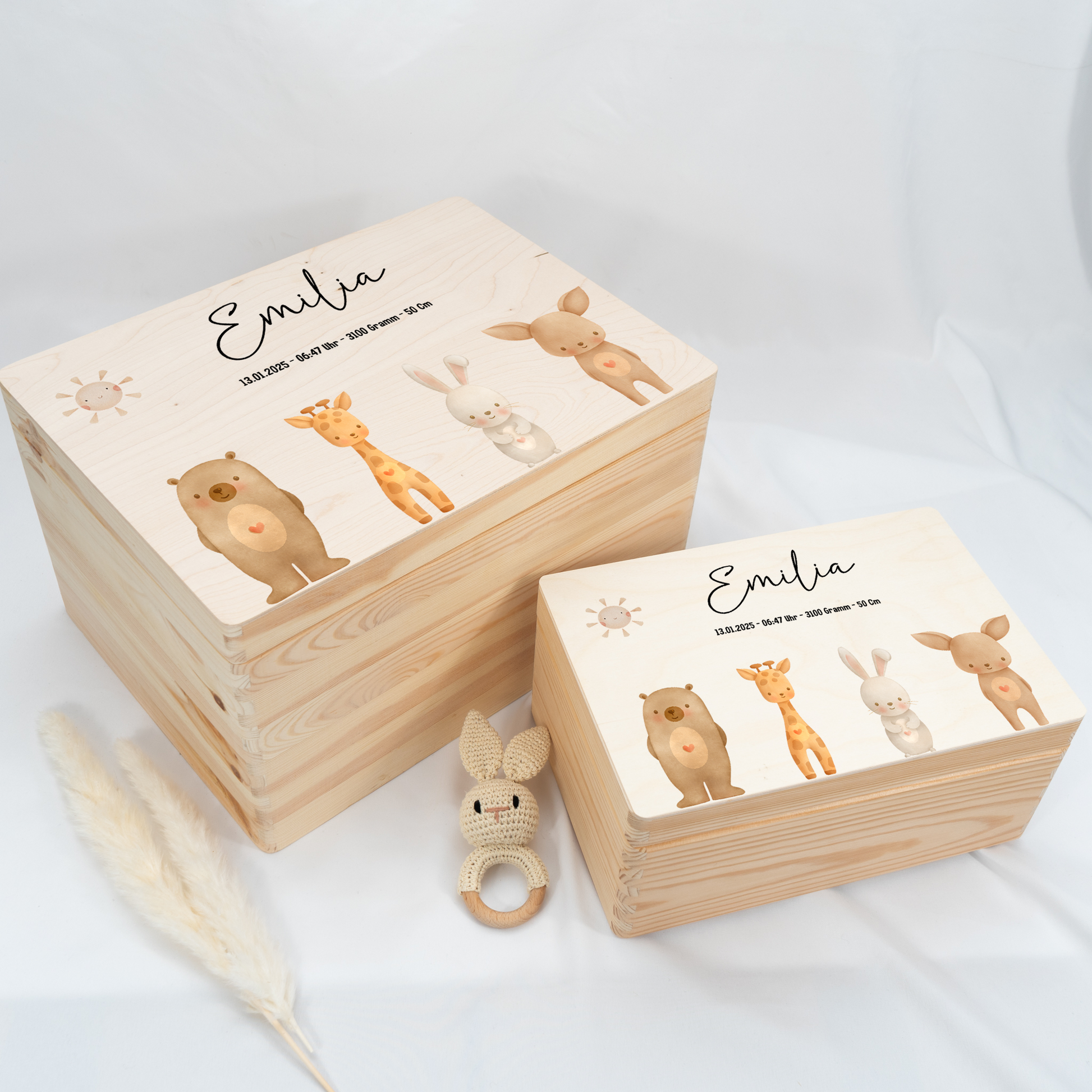 Jede Kiste ist mit viel Sorgfalt gestaltet und wird individuell für dich personalisiert – mit Namen, Geburtsdaten oder einer kleinen Botschaft.