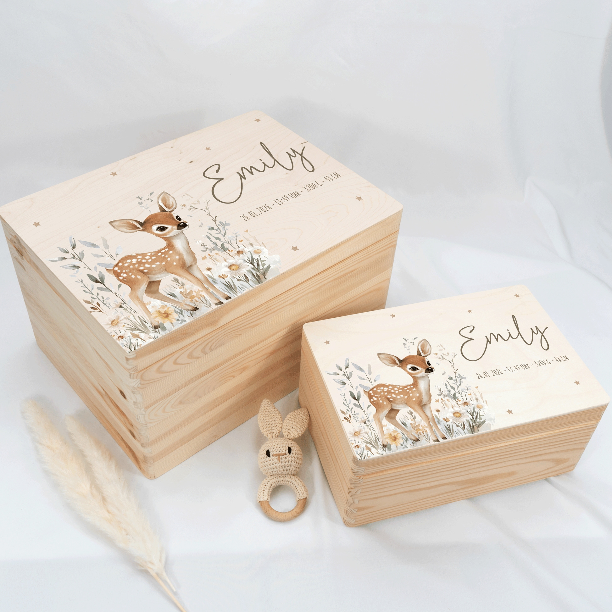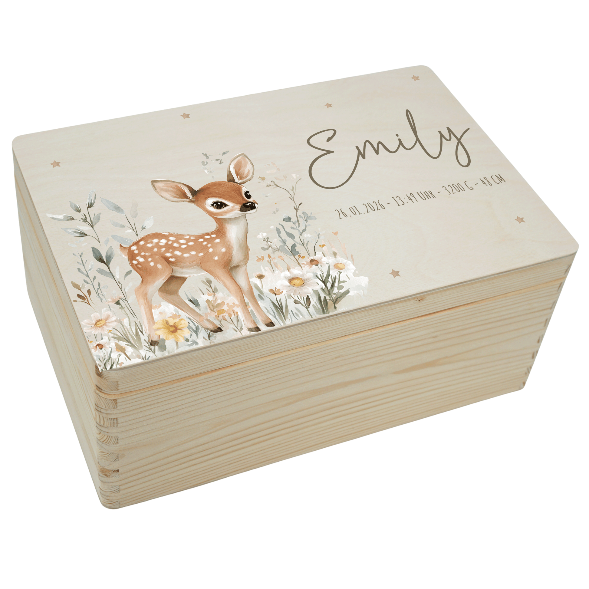 Du kannst jedes Design mit dem Namen des Babys personalisieren – optional auch mit Geburtsdatum, Uhrzeit, Größe und Gewicht. Die Geburtsdaten kannst du selbstverständlich auch weglassen. Wenn nur der Name angegeben wird, passen wir Schriftgröße und Position automatisch so an, dass das Design harmonisch und perfekt wirkt. Jede Kiste wird individuell für dich gestaltet.