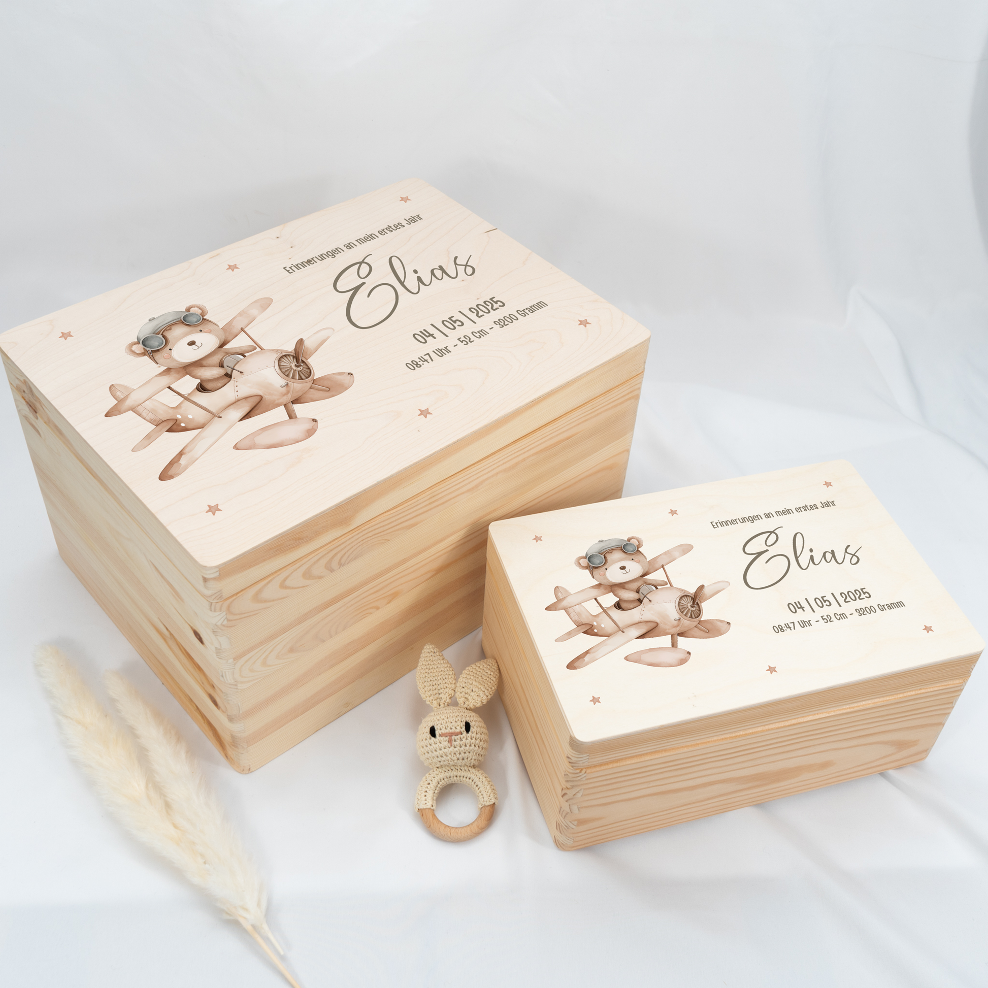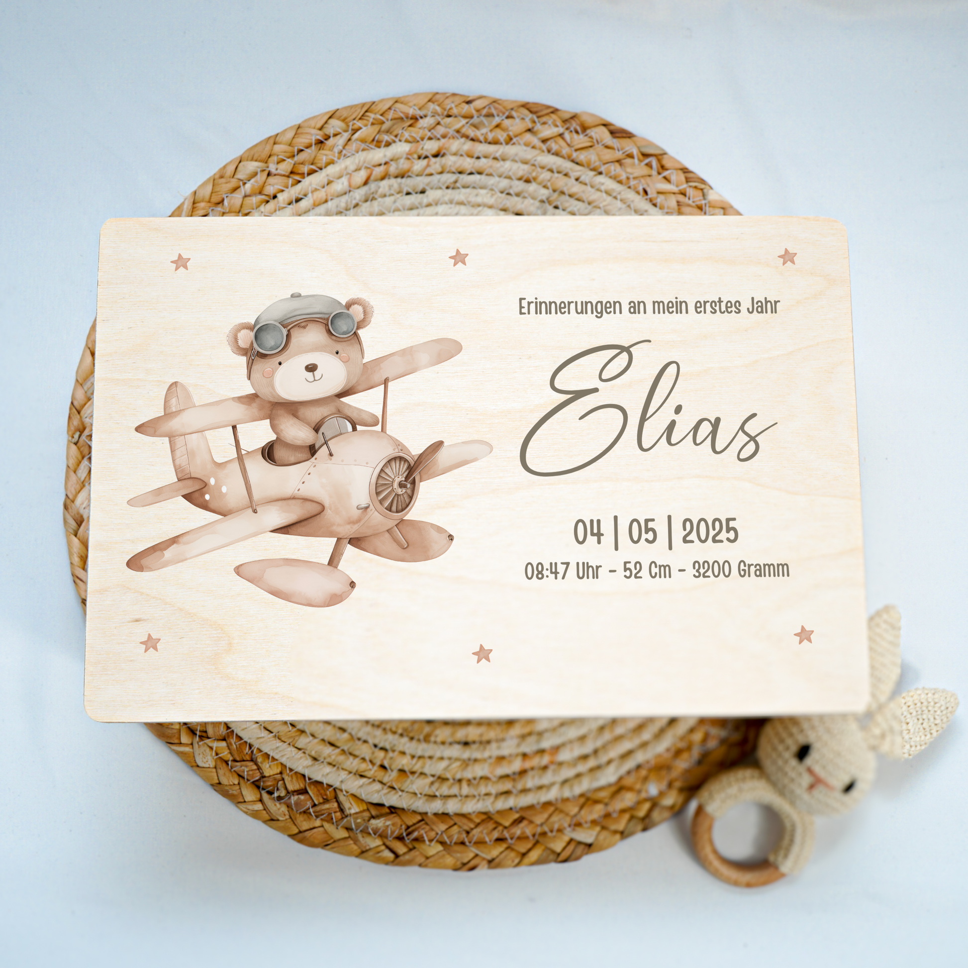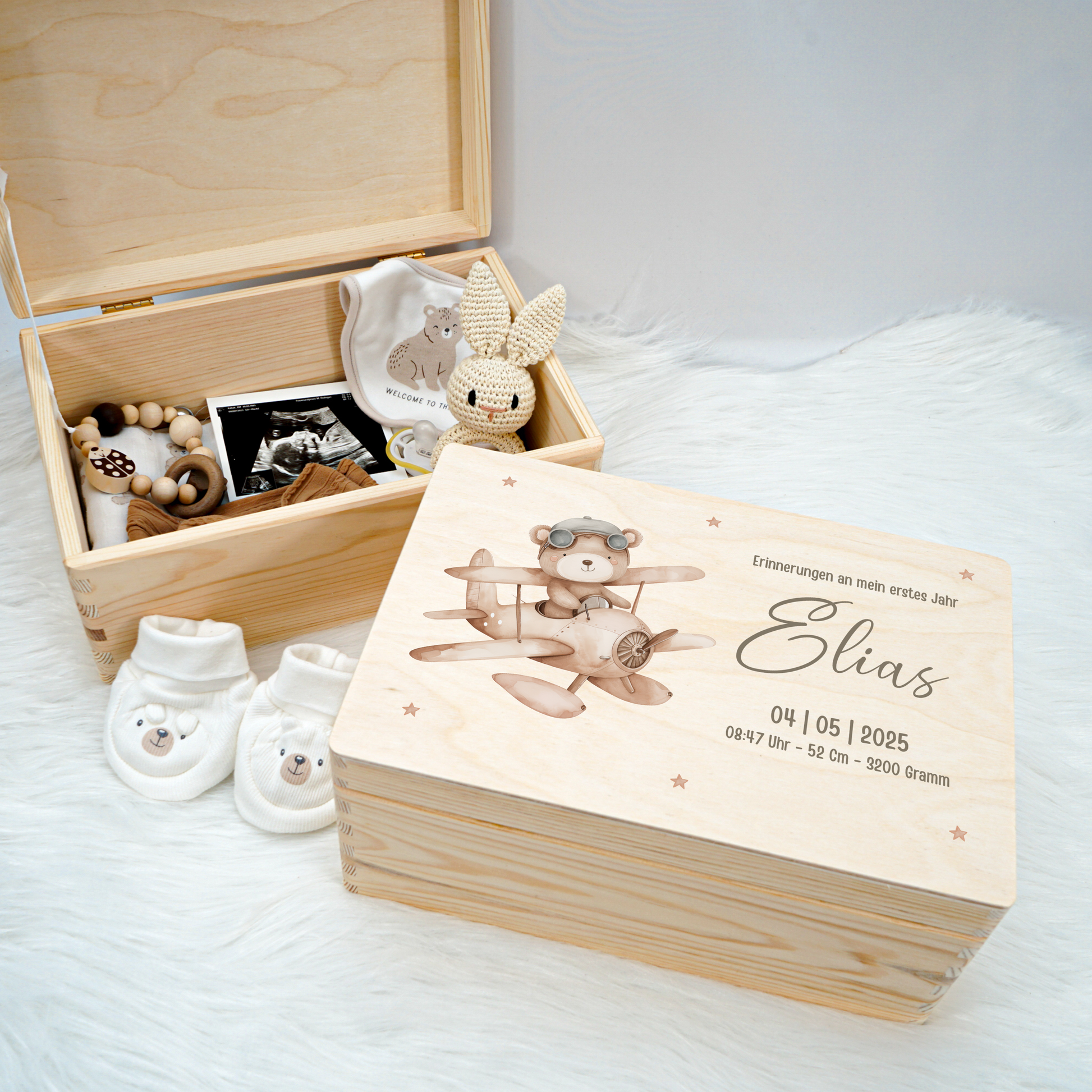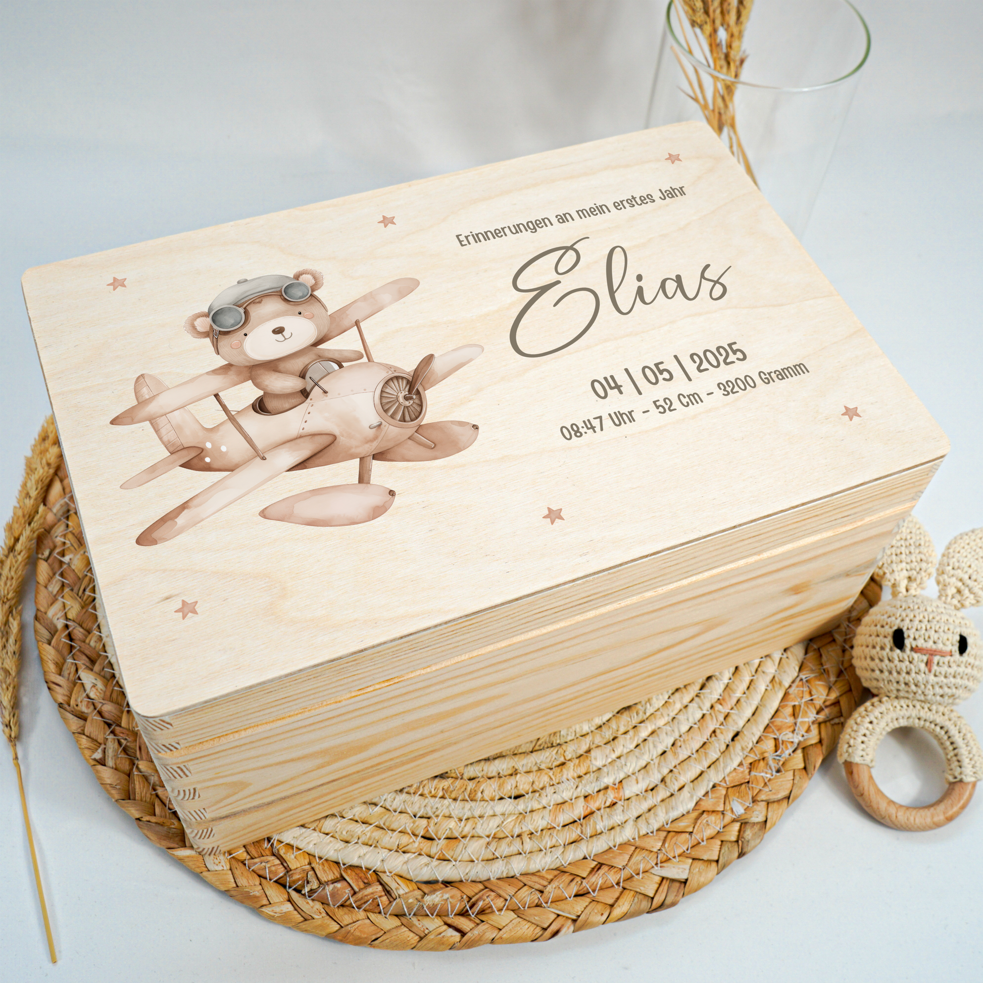 Jede Kiste ist mit viel Sorgfalt gestaltet und wird individuell für dich personalisiert – mit Namen, Geburtsdaten oder einer kleinen Botschaft.