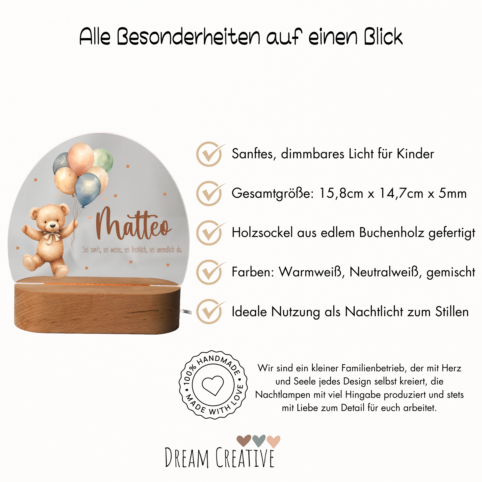 Unsere personalisierte Nachtlampe vereint stilvolles Design mit kindgerechter Funktionalität. Hier sind alle Details, die unsere Nachtlampe zu einem besonderen Highlight machen: