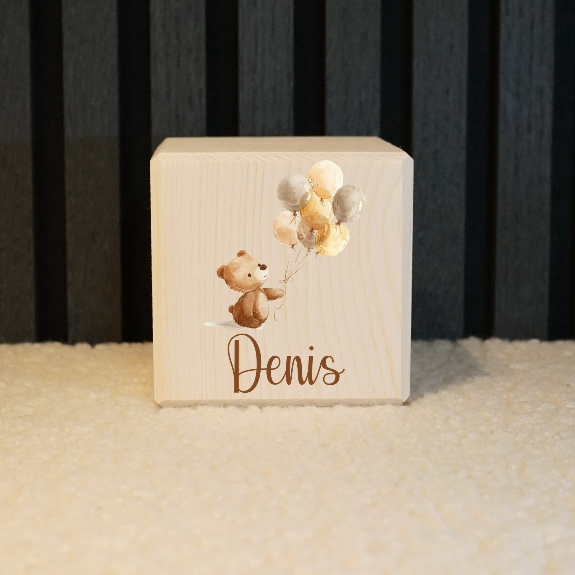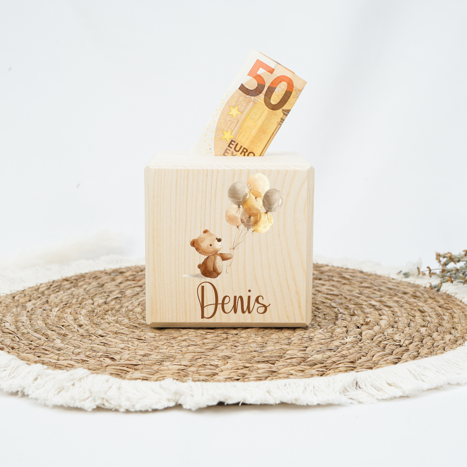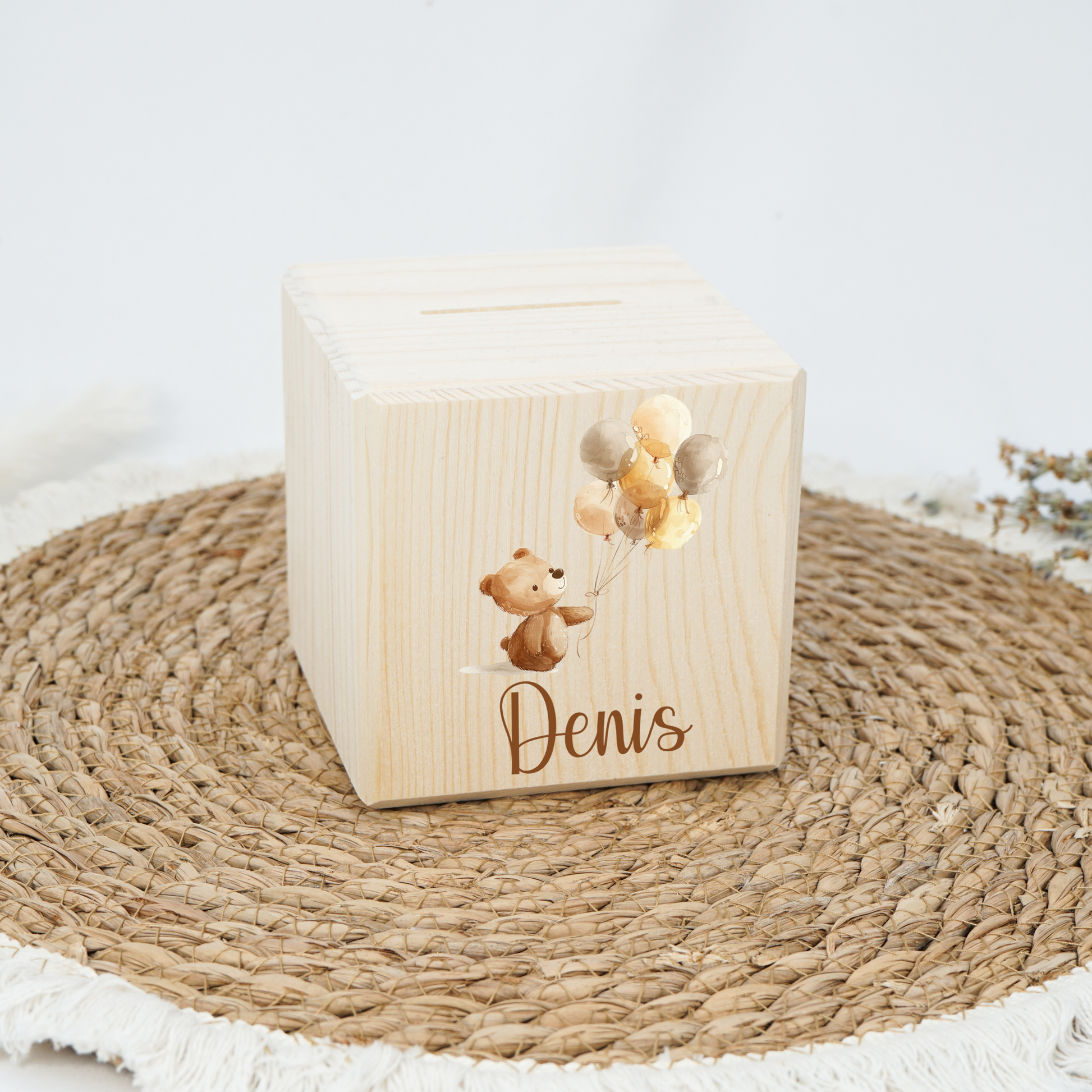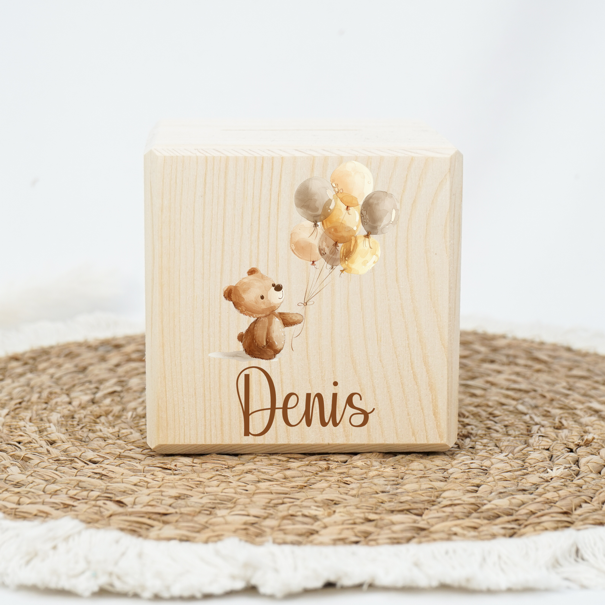 Personalisierte Spardose aus Holz - Teddy & Luftballons